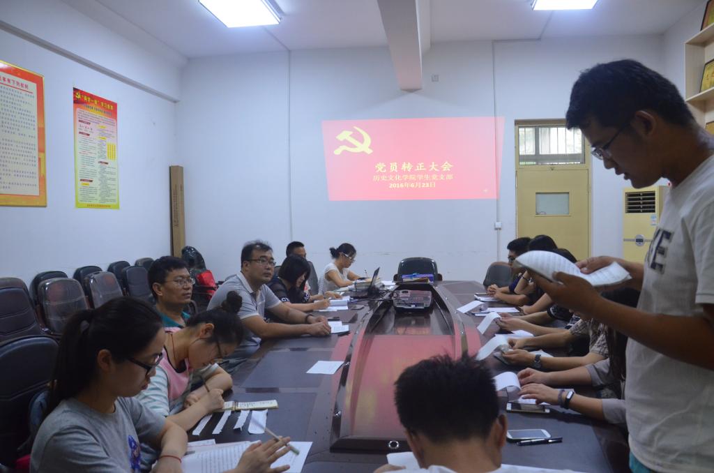 2016年6月23日上午,大乐透 学生党支部在会议室召开党员转正大会以及“两学一做”第一次专题讨论会议。会议由学生党支部书记王建阳主持,党委副书记王慕东列席。