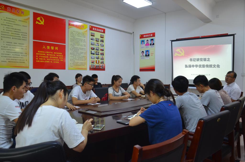 活动第二项议程,进行“书记讲党课之弘扬中华传统优秀文化”活动,党支部书记王建阳为大家上党课,结合院校实际解读了十九大报告中关于优秀传统文化传承创新内容。