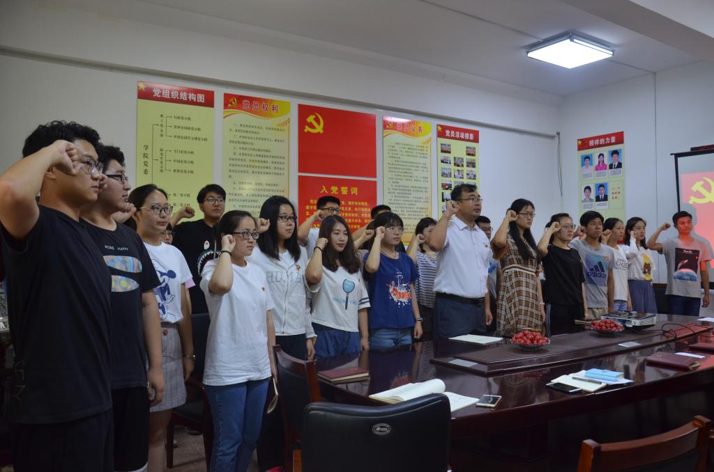 活动分为四项议程,活动进行第一项议程,重温入党誓词活动。庄严肃穆的国际歌奏毕,党员们在本科生党支部副书记李成林同志带领下,面对党旗,一字一句重温誓词。