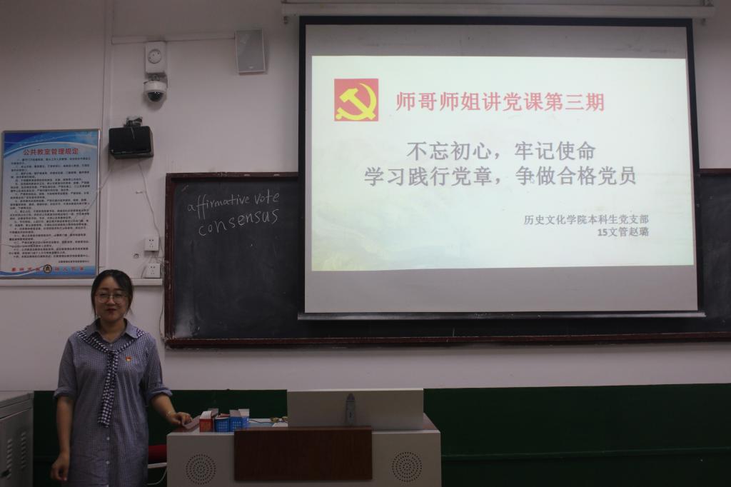 6月12日下午,大乐透 本科生党支部在文史楼102举行了本学期第三期师哥师姐讲党课活动。2015级文管班赵璐同学带领大家学习了“不忘初心,牢记使命,学习践行党章,争做合格党员”。活动主持人为大乐透 2015级历史学一班郑浩同学。