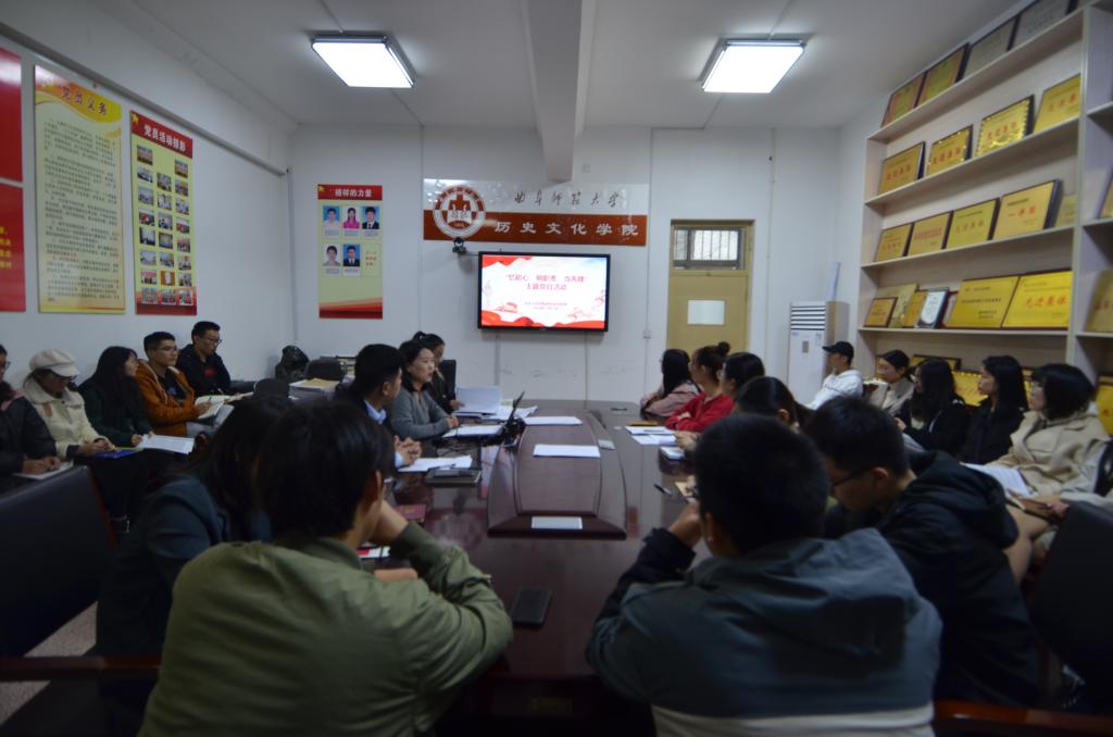 11月11日下午,大乐透 本科生党支部在文史楼二楼会议室开展“忆初心、明职责、当先锋”主题党日活动。活动由学院本科生党支部书记蔺琦琦主持,本科生党支部全体党员参加活动。