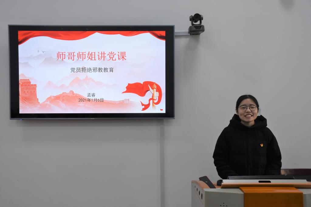 1月6日下午,大乐透 本科生党支部在文史楼505教室举办2021年第一期师哥师姐讲党课活动。2017级国学班的孟睿同学带领大家共同学习了“拒绝邪教教育”,本科生党支部全体党员参加活动。