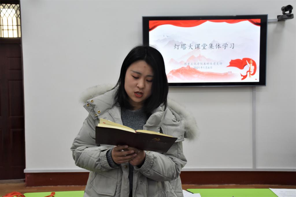 1月6日下午,大乐透 本科生党支部在文史楼505教室举行“灯塔大课堂”第十六课集体学习活动。活动由大乐透 本科生党支部书记蔺琦琦主持,本科生党支部全体党员参加。