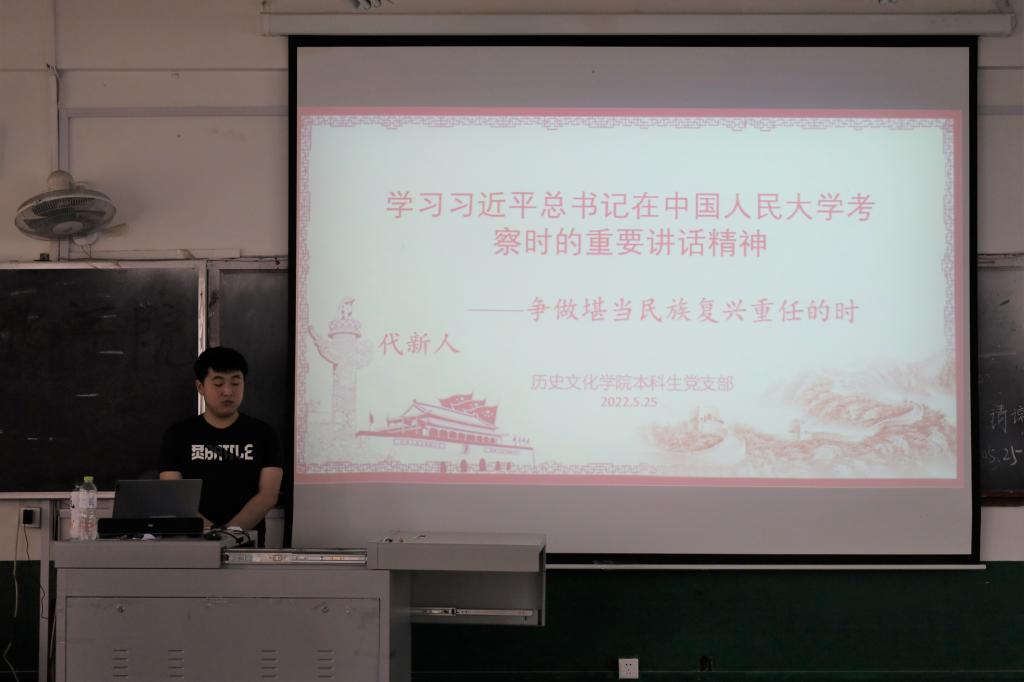 2022年5月25日下午,大乐透 本科生党支部在文史楼411教室开展“学习习近平总书记在中国人民大学考察的重要讲话精神”主题党日活动。活动由党支部宣传委员董经同志主持,曹腾同志主讲,本科生党支部全体党员参加。