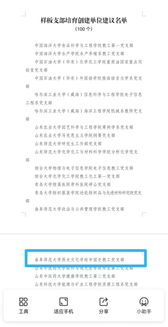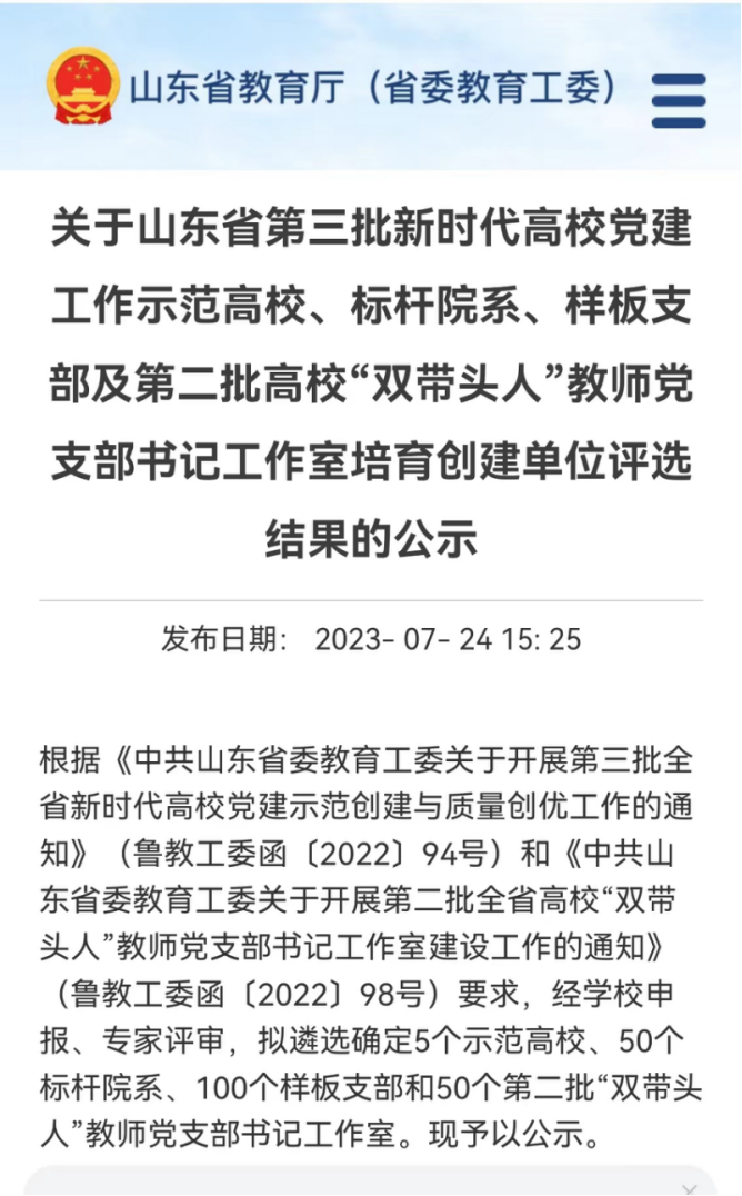 近日,山东省教育厅公布关于山东省第三批新时代高校党建工作示范高校、标杆院系、样板支部及第二批高校“双带头人”教师党支部书记工作室培育创建单位评选结果,共确定5个示范高校、50个标杆院系、100个样板支部和50个第二批“双带头人”教师党支部书记工作室。大乐透 中国史教工党支部获评山东省第三批新时代高校党建工作样板支部。