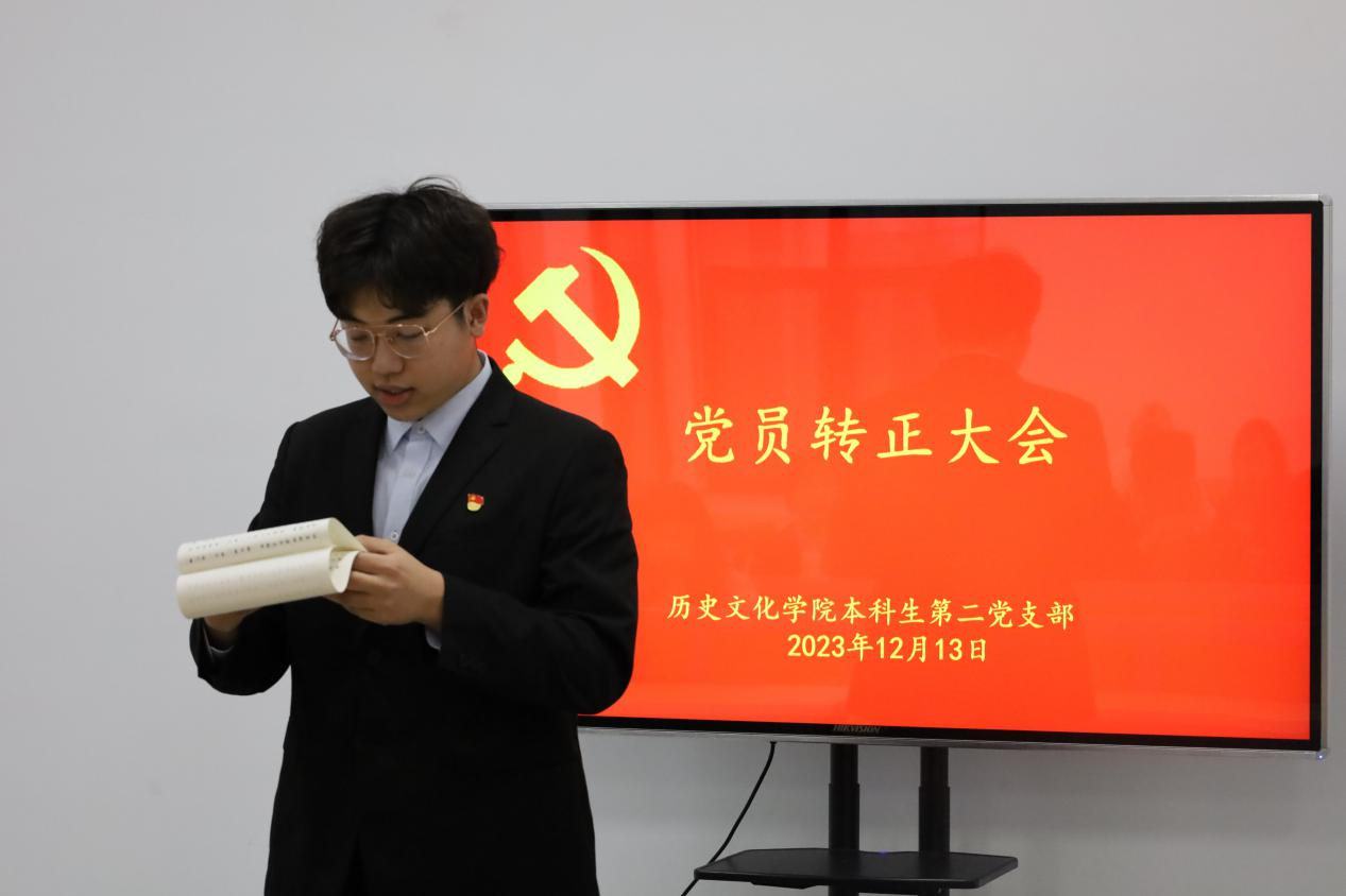 随后,由本科生第二党支部书记刘贤贤同志介绍窦鲁豫、胡佳等4位同志的基本情况,报告与会人数,介绍会议流程,并宣布转正大会开始。