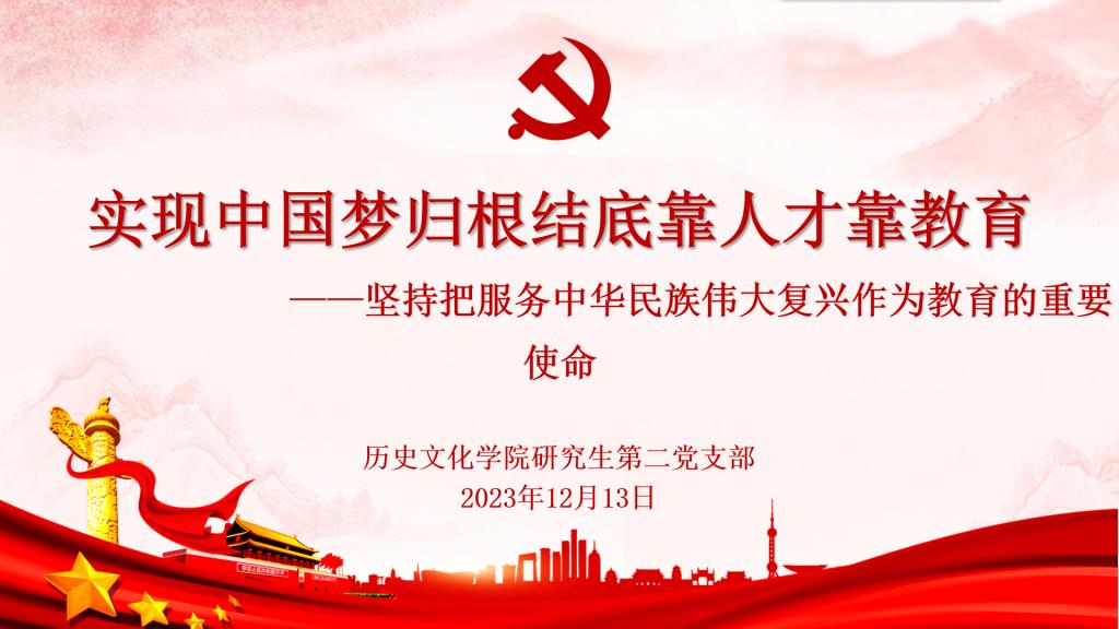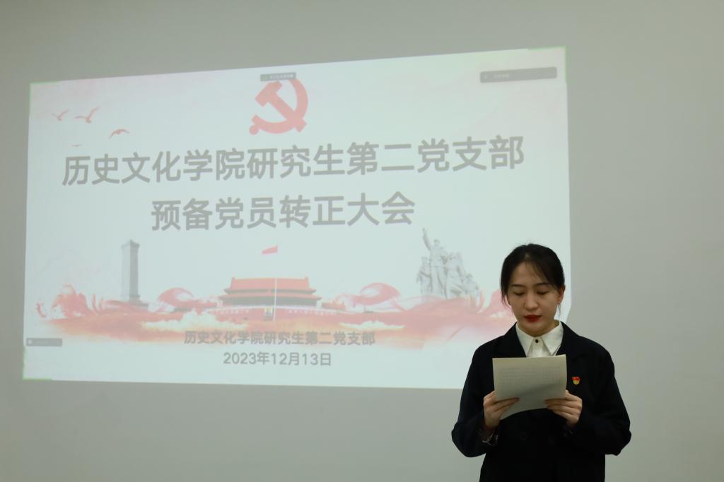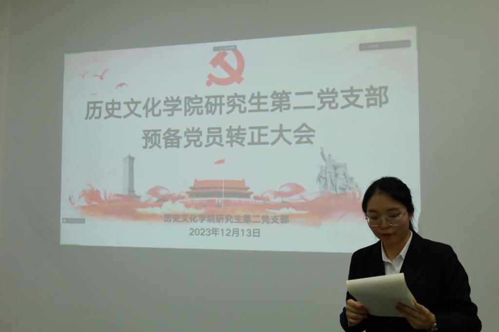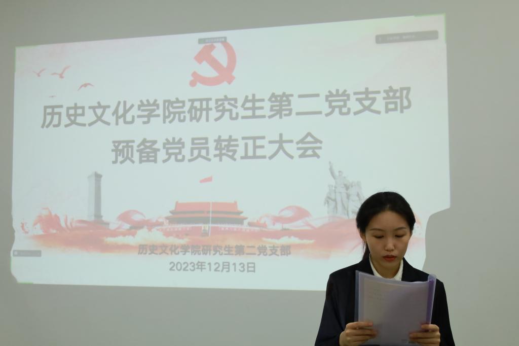 2023年12月13日下午,历史文化研究生第二党支部在孔子书院B103教室开展预备党员转正大会暨12月份主题党日活动。支部全体在校党员参加了本次会议。会议由支部书记苏辰阳同志主持。