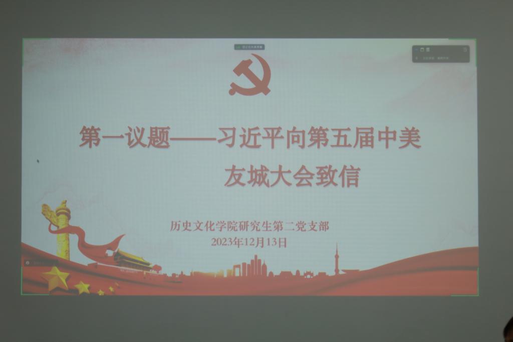 会议开始前,全体与会党员共同开展第一议题学习,学习习近平总书记2023年11月3日向第五届中美友城大会致信内容及相关报道。