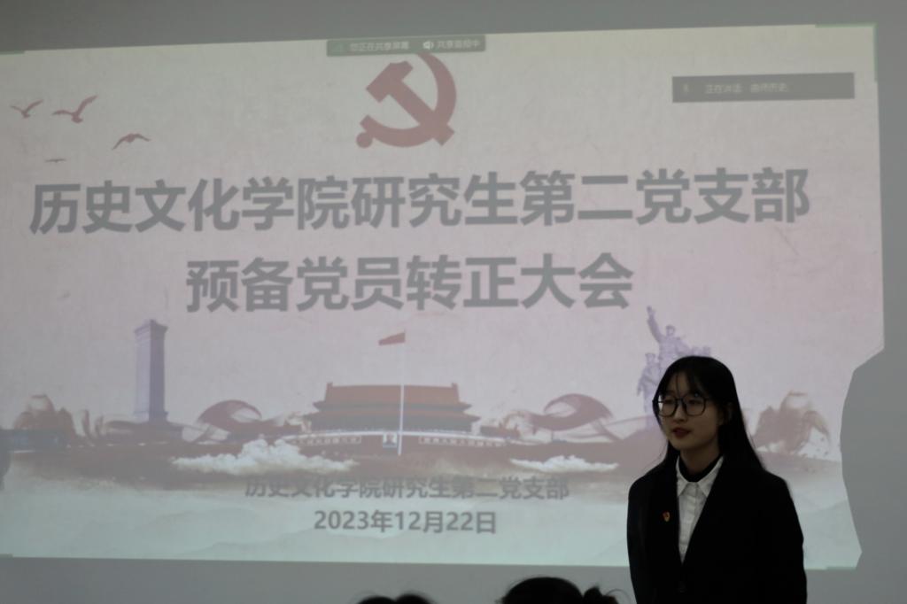 2023年12月22日下午,历史文化研究生第二党支部在孔子书院B103教室开展预备党员转正大会。支部全体在校党员参加了本次会议。会议由党支部纪检委员孟洁同志主持。