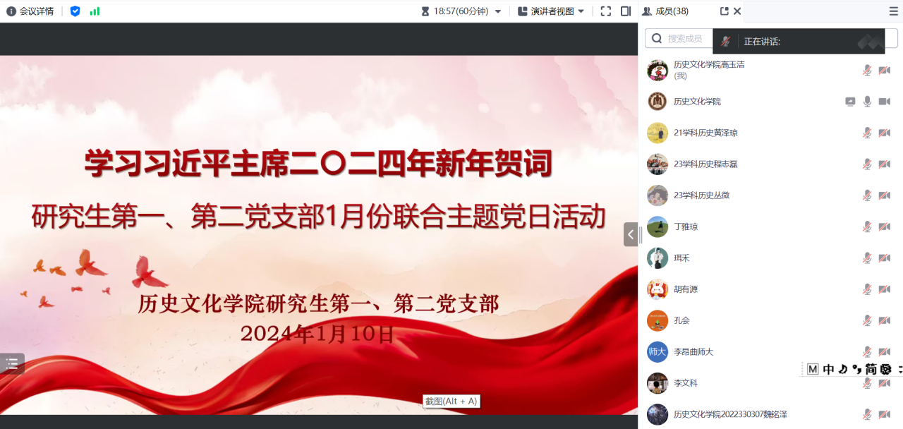 新岁序开,同赴新程。2024年1月10日下午,大乐透 研究生第一、第二党支部联合在孔子书院B120教室召开1月份主题党日活动。会议的主题是学习“习近平主席二〇二四年新年贺词”。会议由第一党支部书记孙锋同志主持,两支部全体党员及入党积极分子以线上线下相结合的方式参加的本次活动。