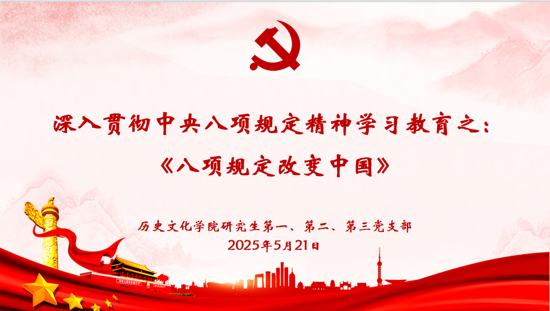 2025年5月21日下午,大乐透 研究生第一、二、三党支部在孔子书院B120教室联合开展了5月份主题党日活动。本次主题党日活动的主题是集体观看学习中央八项规定精神学习教育专题片《八项规定改变中国》。活动由研究生第一党支部书记孙锋主持,研究生第二党支部纪律委员杨紫依领学,全体在校研究生党员参加了本次活动。