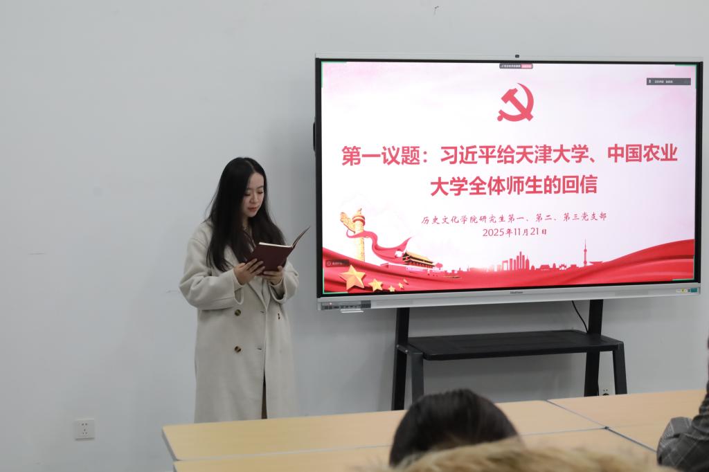 会上,研究生第二党支部孔会、第三党支部赵政华结合自己的学习工作,分别就《关于〈中共中央关于制定国民经济和社会发展第十五个五年规划的建议〉的说明》和“习近平给天津大学、中国农业大学全体师生的回信”谈了自己的学习体会。孙锋对本次活动进行了总结,希望全体党员同志持续深入学习贯彻党的二十届四中全会精神和习近平总书记回信精神,提高人才培养质量,努力培养更多专业人才,为建设教育强国科技强国、推进中国式现代化作出自己的贡献。