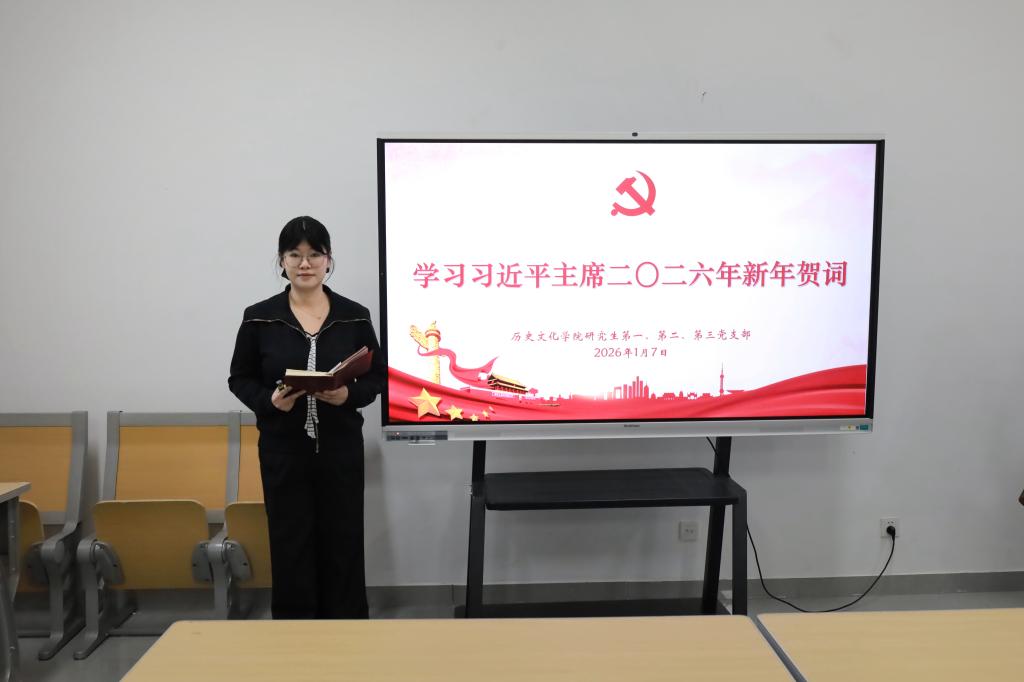 会上,研究生第一党支部徐梦芮、第二党支部邹雅琳结合自己的学习工作,分别就学习贯彻党的二十届四中全会精神和习近平主席二〇二六年新年贺词谈了自己的体会。大家纷纷表示,习近平主席的新年贺词饱含深情、催人奋进,既是对过去一年全党全国各族人民团结奋斗、攻坚克难的充分肯定,也是对开启“十五五”新征程、谱写中国式现代化新篇章的动员号令。