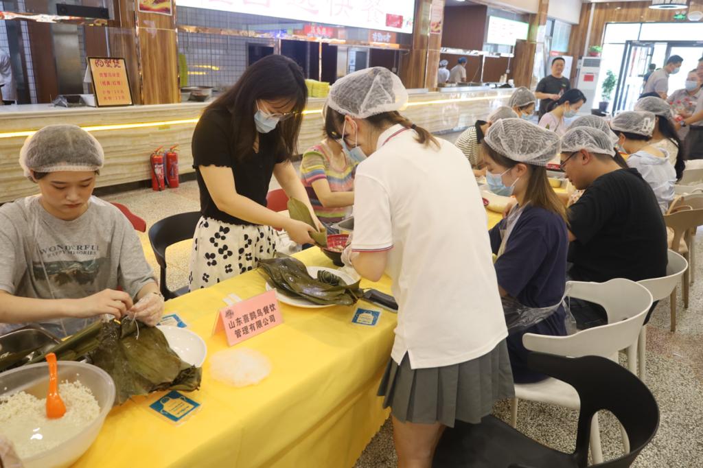 本次活动分为包粽子和端午节知识抢答两个环节。在包粽子环节,师生们以小组为单位,领取了提前准备好的粽叶、糯米、红枣等食材。接着在食堂阿姨的指导下,大家开始一边包粽子,互相交流包粽子的技巧,体验亲手包粽子的乐趣。在端午节知识抢答环节,师生们也都以小组为单位竞相抢答,在愉快的节日氛围里增加对端午节传统知识的了解。