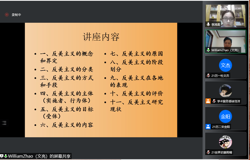 讲座分十一部分进行。第一部分是反美主义的概念和界定,赵文亮教授简要介绍了“反美主义”与“美国化”之间的联系,继而指出目前对于“反美主义”,学界很难给出一个统一的定义。从实质上看,反美主义是一种全球现象,反映了世界各国对美国在国际事务中称王称霸的不满,也体现了对美国大众文化向外扩张的抵制。他从广义和狭义两个方面对反美主义进行区分,并指出反美主义有三个层次:由低到高依次为反美思潮——反美行动——反美政权。