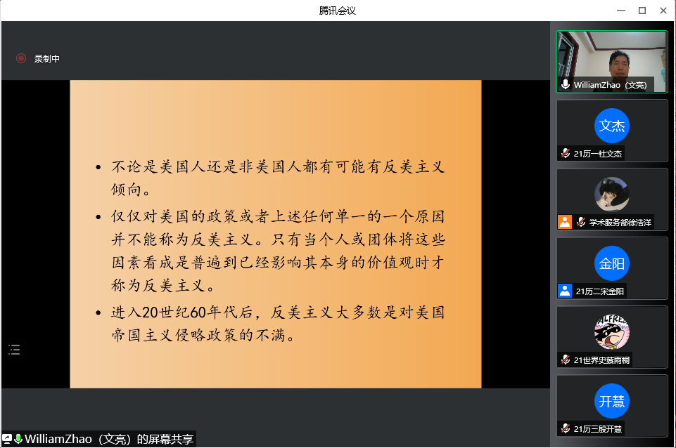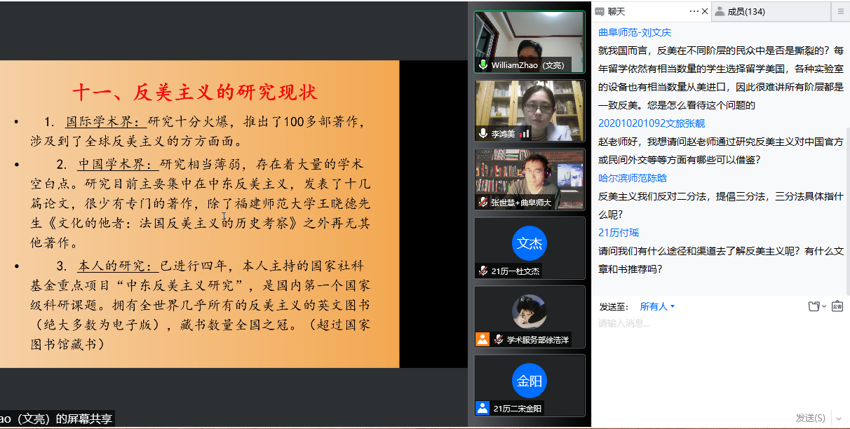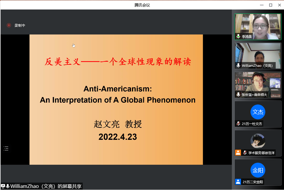 4月23日晚,大乐透 教授、博士生导师赵文亮作客“洙泗讲堂”,通过腾讯会议视频为我校师生作了题为“反美主义——一个全球性现象的解读”的学术报告。报告会由大乐透 李鸿美副教授主持并做评议人,大乐透 相关专业师生及来自全国各地的听众共100余人进行了在线收看,讲座内容十分丰富和精彩。