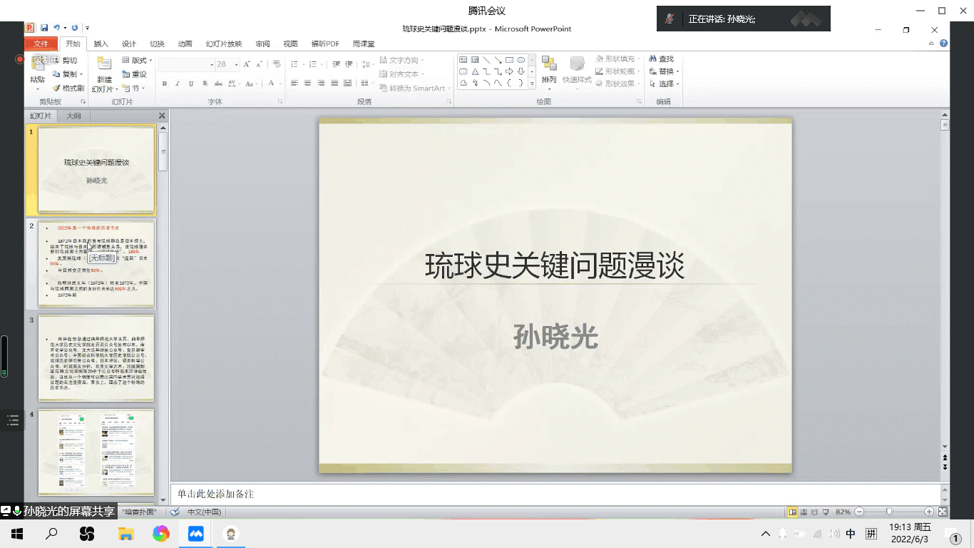 讲座伊始,孙晓光老师先以“2022年是一个特殊的历史节点”——“琉球处分”150年与美国返还日本琉球(冲绳)“施政权”与中日邦交正常化50年以及自明洪武五年(1372年)始至1872年,中国与琉球两国之间的友好往来的“500年”的特殊时间节点,引出琉球史研究的意义:有利于丰富历史学的学科建设,在微观上对世界史、海疆史、中国史以及考古学的学科建设发展具有重要意义;琉球史研究也有助于认识分析现实东亚国际关系当中出现的一些棘手问题,例如钓鱼岛问题、东海问题与南海问题为主的东亚海域纷争;对琉球史的研究也有助于了解中琉友好交流的历史文化基础。 孙老师还向大家展示了历史学界对琉球问题的关注:2013年5月8日,时任中国史学会会长张海鹏先生与中国社会科学院中国边疆研究中心李国强先生在《人民日报》上发表了《论<马关条约>与钓鱼岛问题》的文章,其结尾提到“历史上悬而未决的琉球问题也到了可以再议的时候”,引发了学术界与政策界的高度关注。孙老师针对文章中提到的琉球“再议”问题梳理了四点启示:琉球“再议”议什么的问题;应加强“琉球墓园”、“琉球馆”等见证琉球历史和见证中琉交往历史的文物古迹保护、修缮工作;应充分研判“琉球再议”对东亚海域争端影响的连锁效应;关注琉球人的“民意选择“。此外,他还展示了“琉球民族独立综合研究学会”的成立宗旨。