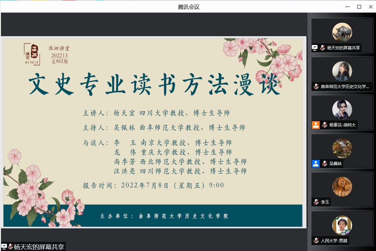 为让学生度过一个有意义的暑假,2022年7月8日上午9点早,大乐透 以讲座的形式开启了暑期读书计划。本期讲座主题为“读书六法:朱熹读书方法演绎”。 主讲人为四川大学教授、博士生导师杨天宏教授。讲座由大乐透 吴佩林教授主持,南京大学李玉教授、四川师范大学汪洪亮教授、重庆大学龙伟教授、西北师范大学尚季芳教授、中国人民大学刘贤副教授担任与谈人。讲座采取腾讯会议直播的方式进行,相关专业师生及线上听众共300余人参加了此次活动,讲座内容十分精彩。