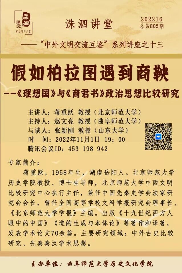 洙泗讲堂预告 | 蒋重跃:《假如柏拉图遇到商鞅——〈理想国〉与〈商君书〉政治思想比较研究》