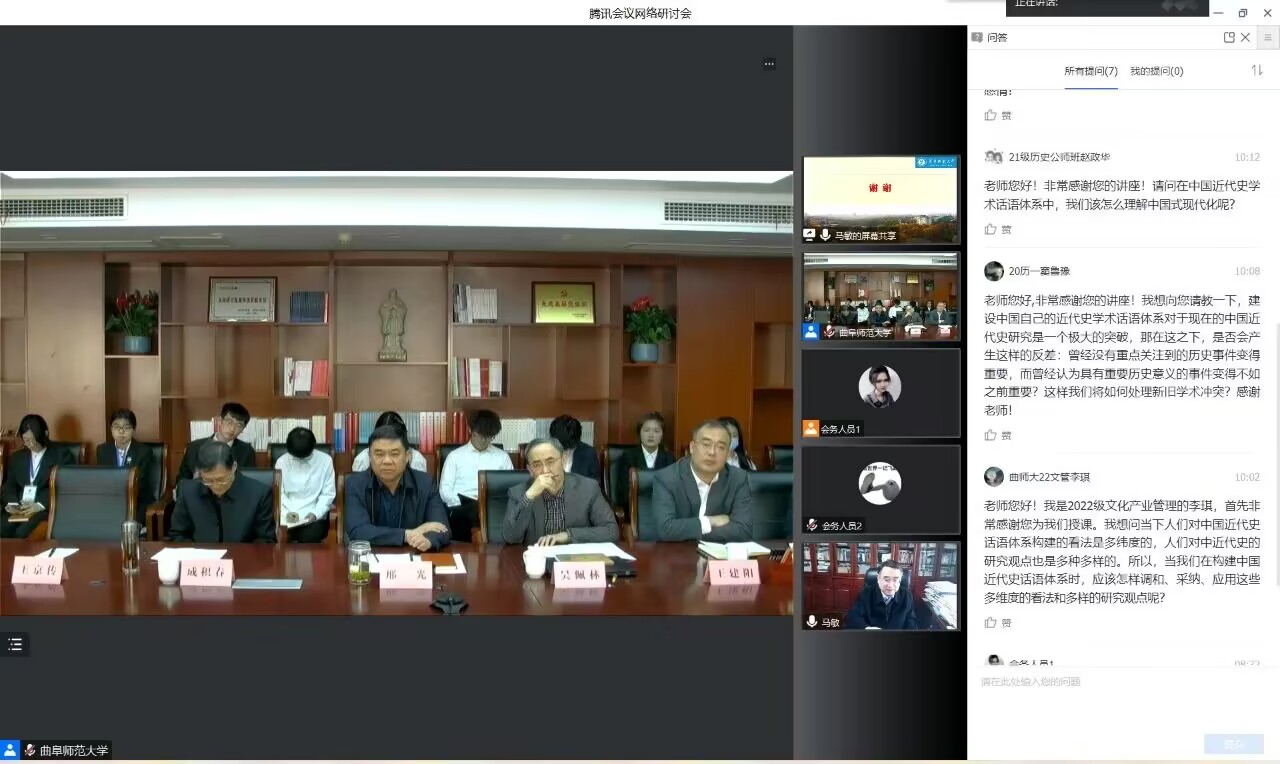 习近平总书记指出,发挥我国哲学社会科学作用,要注意加强话语体系建设,要善于提炼标识性概念,打造易于为国际社会所理解和接受的新概念、新范畴、新表述,引导国际学术界展开研究和讨论。2023年3月23日,华中师范大学中国近代史研究所所长马敏教授做客“洙泗讲堂”,通过线上腾讯会议为我校师生作了题为“中国近代史学术话语体系建设的若干思考”的学术讲座。本次讲座由大乐透 党委书记邢光主持,大乐透 院长吴佩林教授与张世慧副教授担任与谈人,大乐透 成积春教授、王京传教授、党委副书记王建阳老师以及300余名线上听众参与了此次活动。