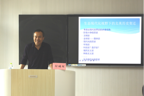 接着付成双引出了本次讲座的主题之一——现代化,对于现代化付成双总结了关于现代化的各种定义,包括技术的、狭义的、广义的和作为一种战略和对策的现代化以及作为一种研究视角的现代化,除此还是作为一个历史进程的美国现代化,对于其定义,付成双通过希尔斯的话让学生们理解了现代化的定义:“现代意味着民主和平等、科学、经济的进步和主权。现代国家是福利国家,把实现所有人的福利,尤其是低阶层的福利作为他们的首要目标。现代国家意味着它必然是民主国家,不仅其国民得到施政者的照顾,而且他们还是灵感的源泉和施政者的引导者。现代性带来民主,而在这些新兴国家中,民主首先是平均。因而,现代性会导致富裕者和特权阶层从传统的显要地位上被推翻。它包括土地改革;它包括深度的累进所得税。它带来普选。现代性带来大众公共教育,现代性是科学,它相信国家的进步依靠理性的技术,还有更根本的科学知识。没有一个国家可以不通过经济发展和进步而达到现代化。经济上的进步意味着有一个建基于现代技术之上的经济,工业化而且具有较高的生活水平”。付成双通过举例美国工业化和曼彻斯特等带我们区分了狭义的和广义的现代化定义,接着又层层深入的带领着学生认识了环境史,现代化视角下的环境史等定义。