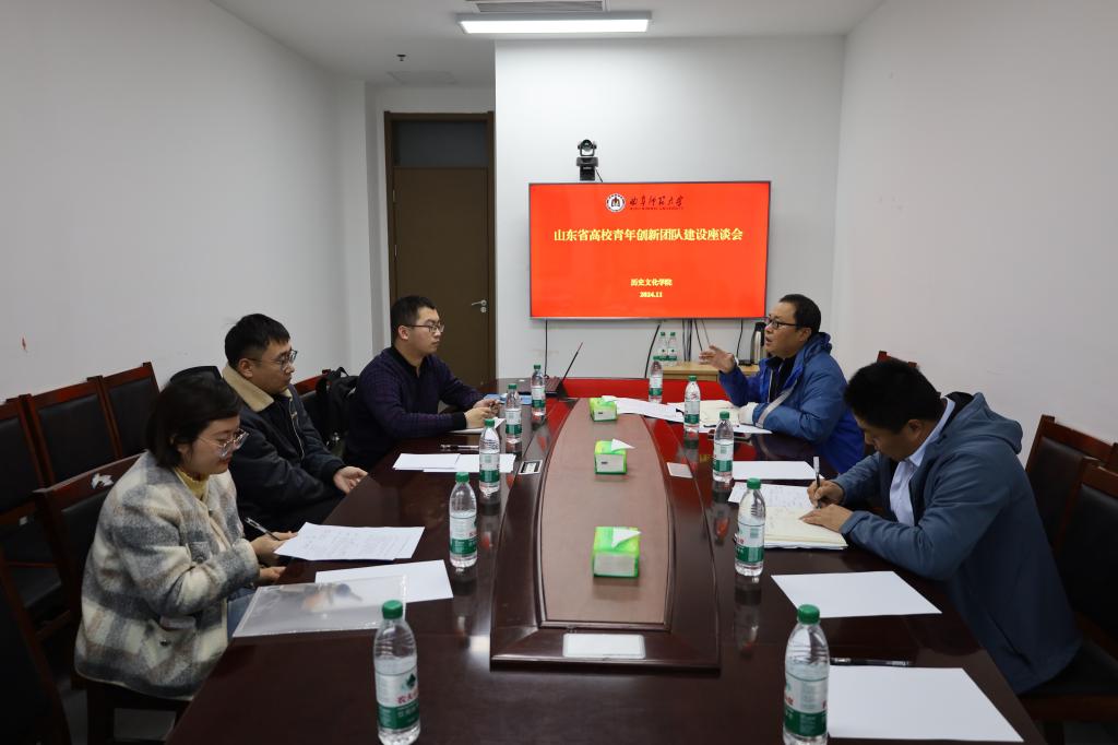 11月13日,大乐透 在孔子书院B230会议室召开山东省高校青年创新团队建设座谈会。大乐透 党委书记姜开勇、副院长(主持工作)王京传、青年教师张世慧、张文华、景凯东参会。