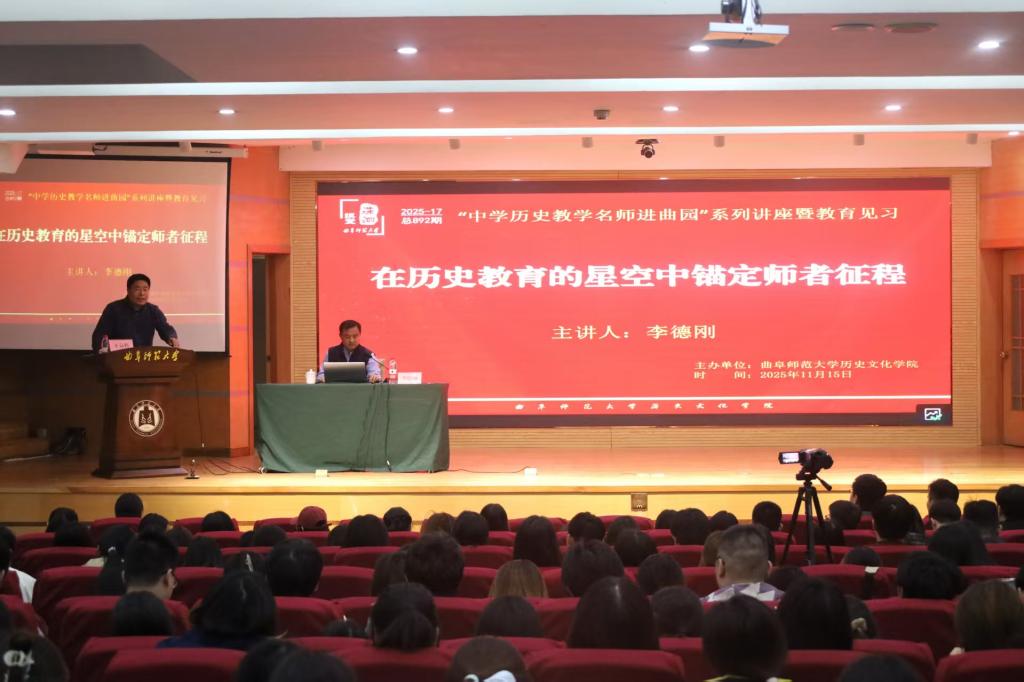 2025年11月15日,洙泗讲堂“中学历史教学名师进曲园”暨2023级历史师范专业教育见习活动在孔子会堂举行。北京中学高中历史教师,正高级教师、特级教师、教育部新时代中小学学科领军教师李德刚主讲“在历史教育的星空中锚定师者征程”学术报告。报告由王京传教授担任主持人,学院教师、2023级历史师范专业学生300余人参加此次讲座。