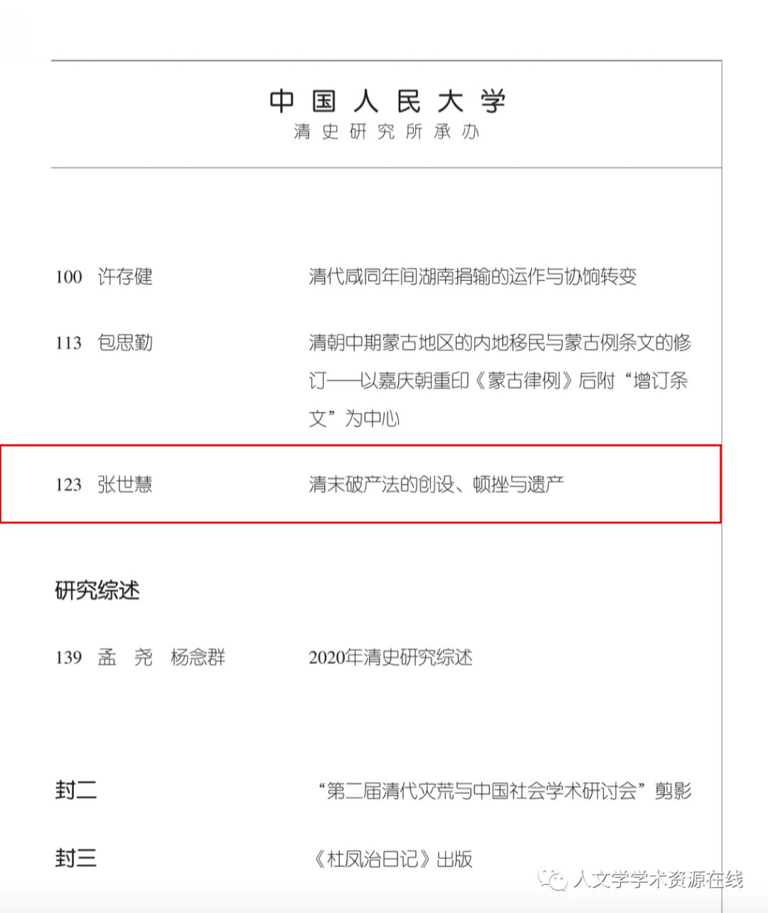 大乐透 张世慧副教授《清末破产法的创设、顿挫与遗产》一文被收录于《清史研究》2021年第6期