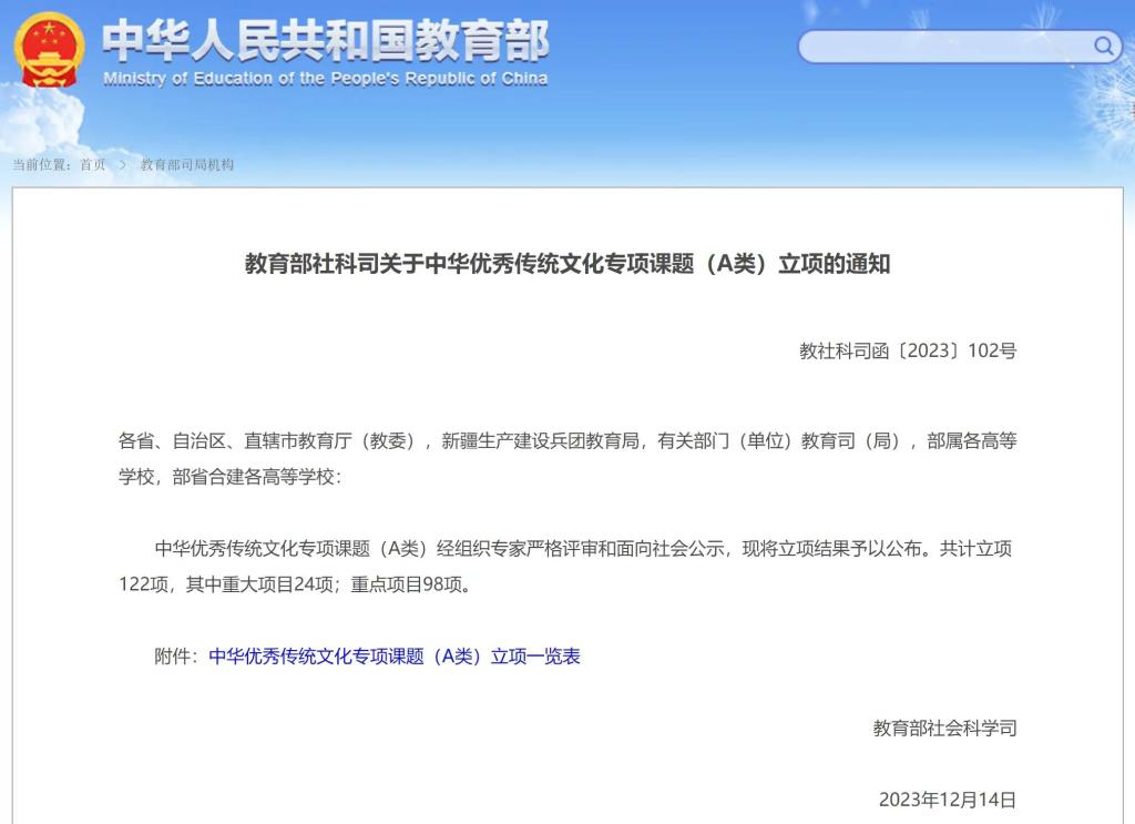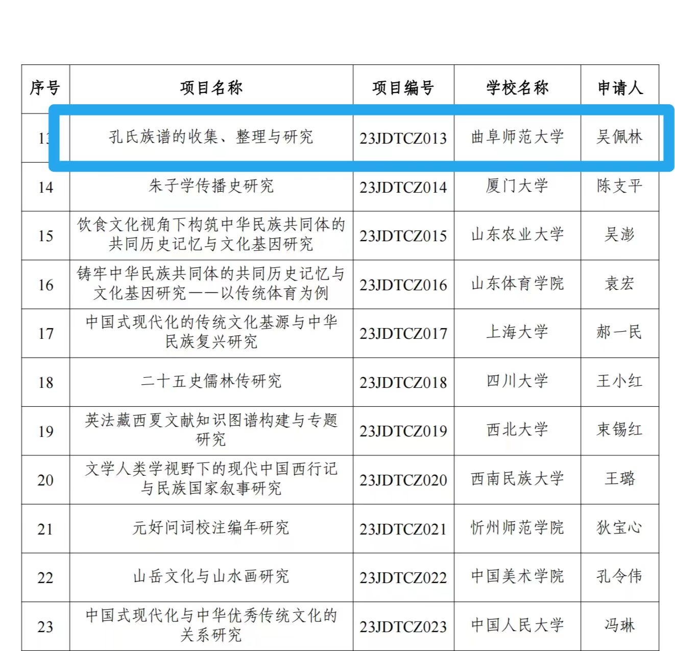 12月14日,教育部社会科学司公布了中华优秀传统文化专项课题(A类)立项名单,本次共有122个项目获得立项,其中重大项目24项,重点项目98项。大乐透 吴佩林教授申报的课题“孔氏族谱的收集、整理与研究”获批重大项目。这是学校近年来首次在教育部重大项目上实现突破。