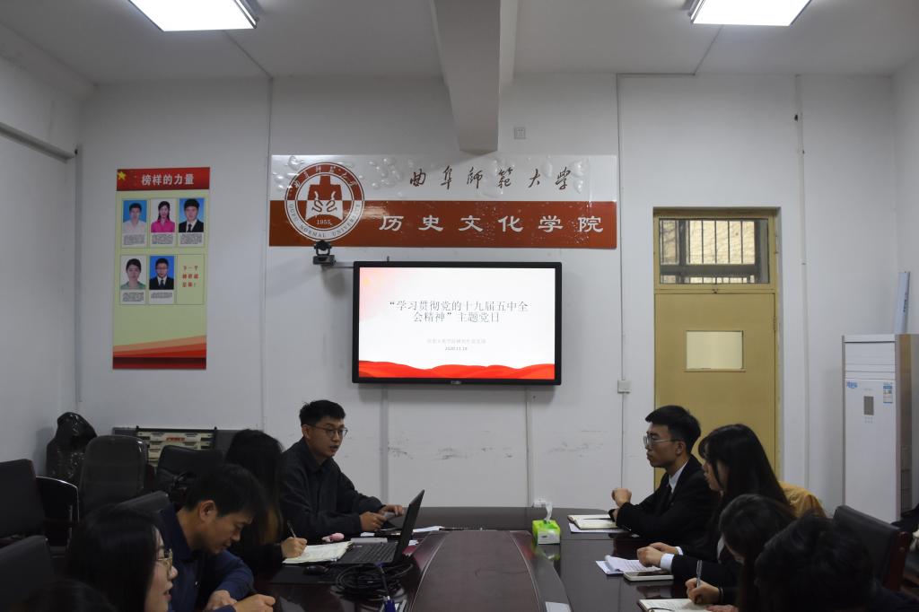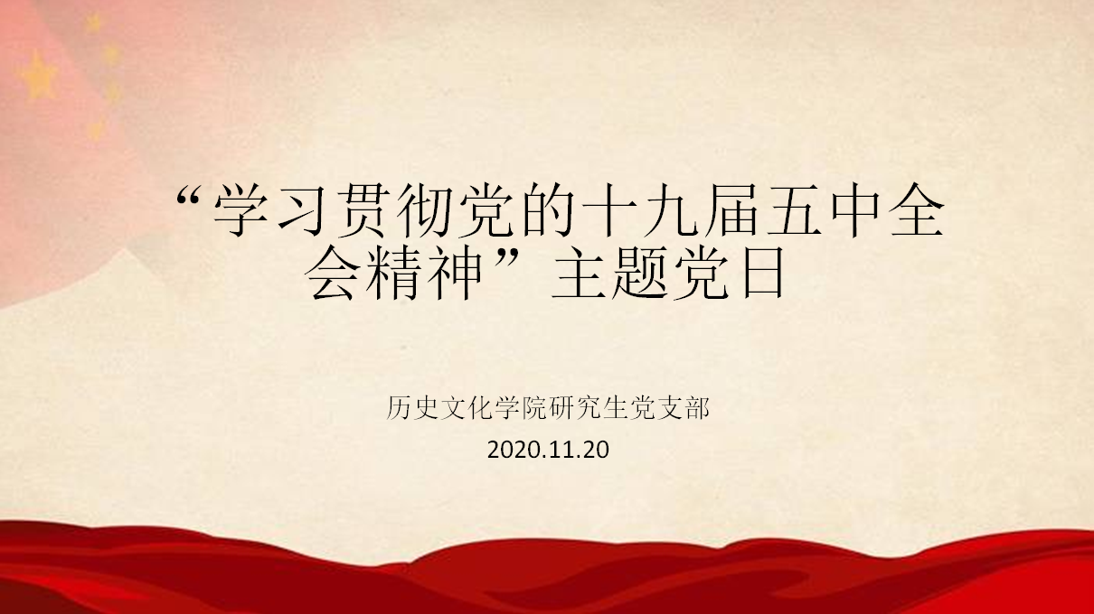 11月20日下午3点,大乐透 研究生党支部在文史楼二楼会议室举行“学习贯彻党的十九届五中全会精神”主题党日活动。研究生党支部书记孙锋同志主持活动,研究生党支部宣传委员徐丽砚同志领学,支部全体党员同志参加了本次党日活动。