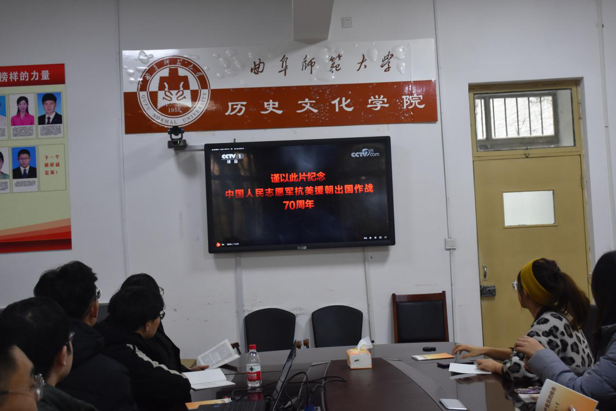2018级研究生团支部组织18级研究生团员在文史楼505会议室观看了大型电视纪录片《为了和平》,活动由2018级团支部书记魏子贺主持。观看结束后,同学们纷纷表示,回首这段波澜壮阔的历史,我们需要看到中国人民保护自己国土的决心从未动摇,抗美援朝战争的必要性和正义性是不容抹杀的,伟大的中国人民是吓不到的!正义终将胜利,英雄精神不朽。魏子贺感慨到:“抗美援朝向全世界第一次显示了新中国已成为维护世界和平与正义的重要力量。而在朝鲜停战以后,中国人民志愿军又为了和平主动撤军,至今在朝鲜没有一兵一卒。历史是公正的,谁在真正维护世界和平,抗美援朝战争就是一个证明!”