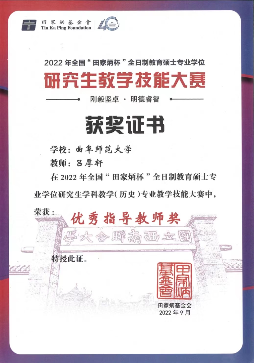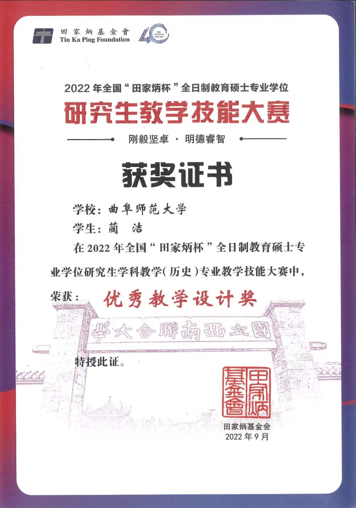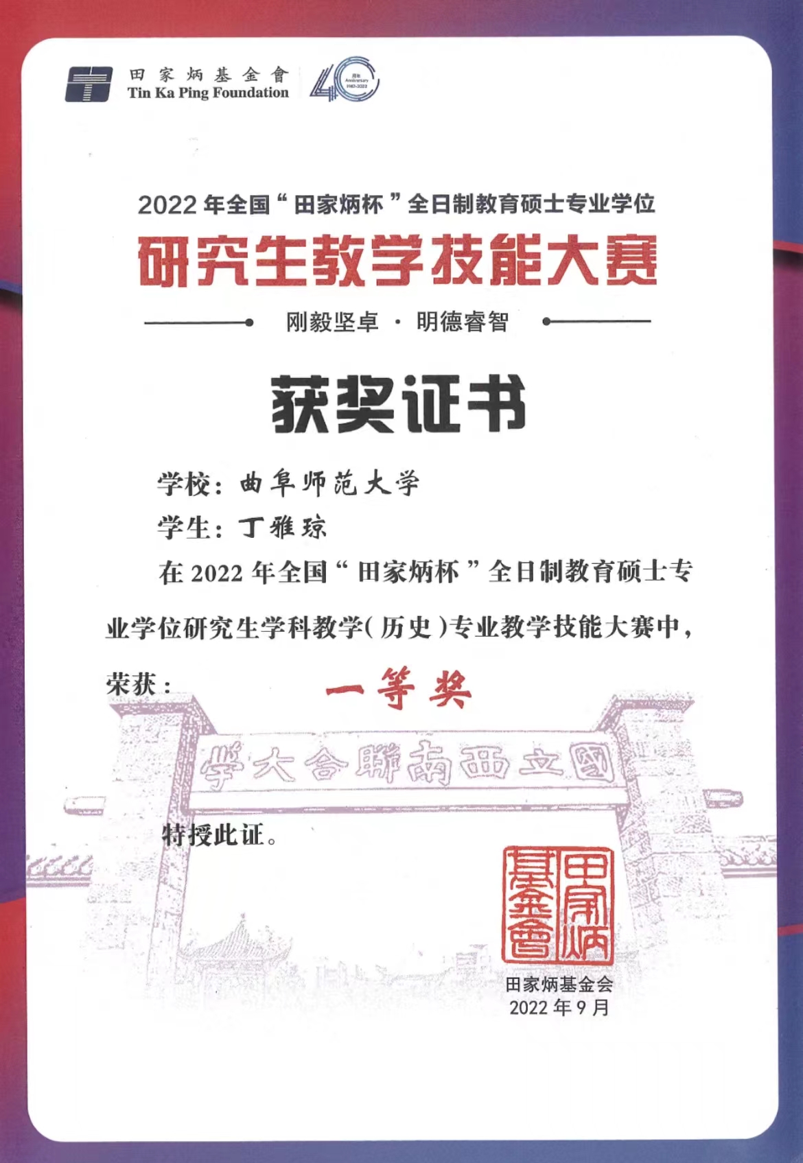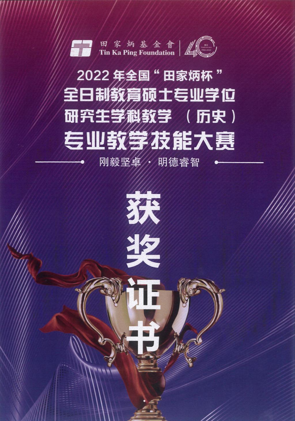 2022年6月27至28日,由全国教育专业学位研究生教育指导委员会主办、云南师范大学承办的2022年全国“田家炳杯”全日制教育硕士专业学位研究生学科教学(历史)专业教学技能大赛决赛成功举办。本次比赛通过线上形式举行,来自华东师范大学、华中师范大学、东北师范大学等全国73所院校的348名优秀参赛选手各展风采,展开一场高水平的教学技能较量。经过学校选拔和国赛初选,共有174名选手进入决赛,经决赛评审,共评选出一等奖18名,二等奖36名,三等奖52名,优秀教学设计奖34名。大乐透 研究生丁雅琼(指导教师:吕厚轩)荣获一等奖,实现了大乐透 学科教学(历史)教育硕士教学能力大赛的新突破!此外,大乐透 研究生蔺洁(指导教师:张亚宁)荣获优秀教学设计奖,指导教师吕厚轩荣获“优秀指导教师”的称号。
