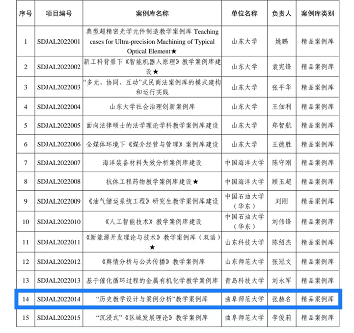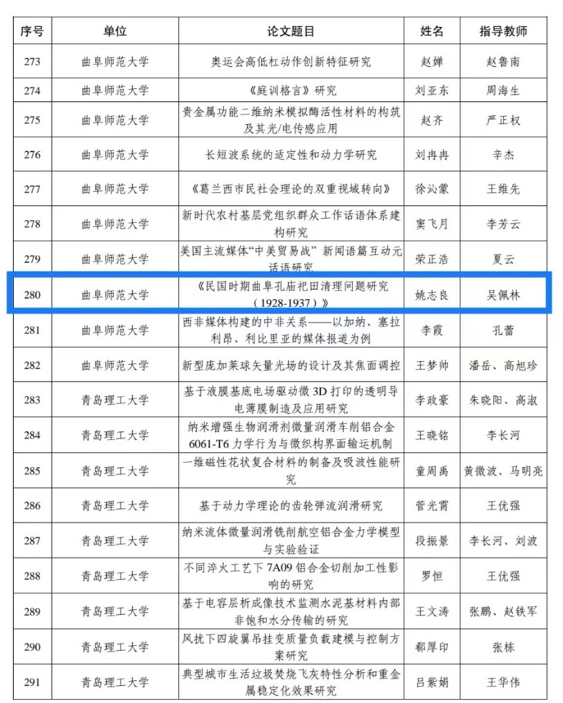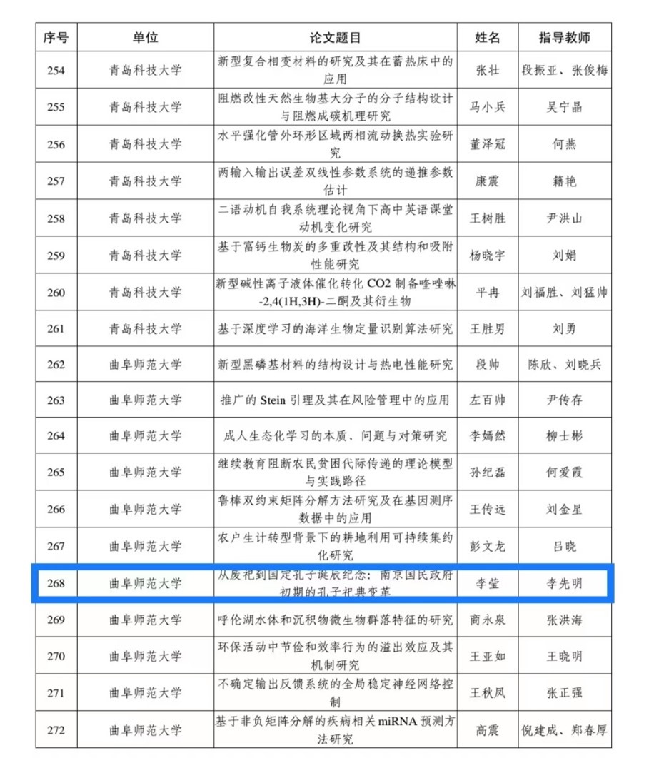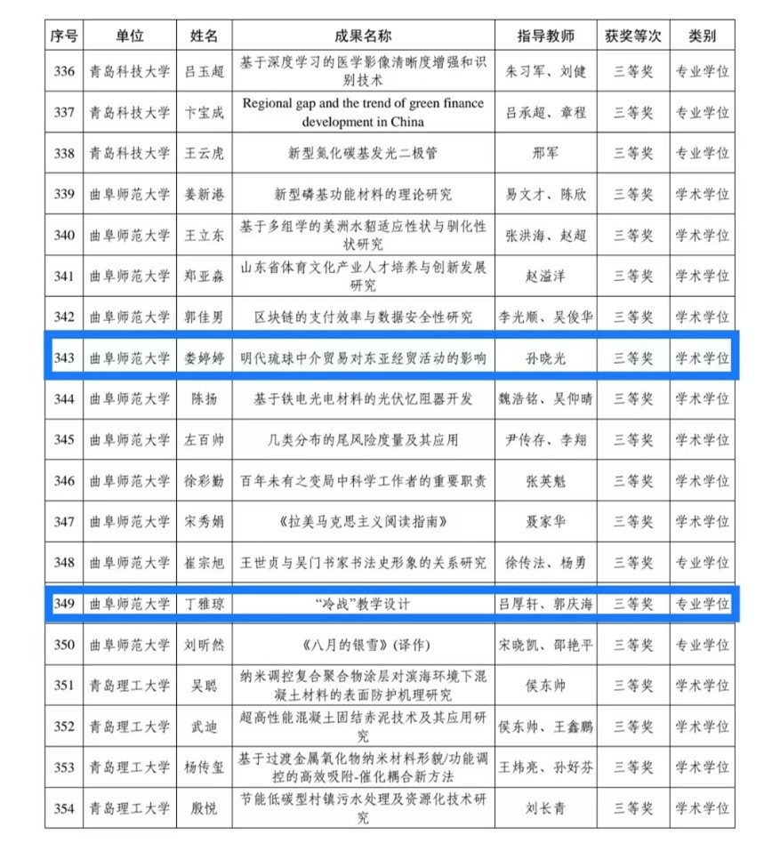 近日,山东省教育厅下发《关于公布2022年研究生导师指导能力提升项目评选结果的通知》《关于公布2022年山东省研究生优质教育教学资源项目立项建设名单的通知》。大乐透 张赫名副教授申报的“历史教学设计与案例分析”教学案例库荣获2022年山东省优质专业学位教学案例库;2018级中国史专业研究生李莹同学的硕士学位论文《从废祀到国定孔子诞辰纪念:南京国民政府初期的孔子祀典变革》(指导教师李先明教授)、姚志良同学的硕士学位论文《民国时期曲阜孔庙祀田清理问题研究(1928-1937)》(指导教师吴佩林教授)获2022年山东省优秀硕士学位论文;2020级世界史专业研究生娄婷婷同学申报的科研成果“明代琉球中介贸易对东亚经贸活动的影响”(指导教师孙晓光教授)、2021级学科教学(历史)专业研究生丁雅琼同学申报的科研成果“冷战教学设计”(指导教师吕厚轩副教授、郭庆海讲师)获2022年山东省研究生创新成果。