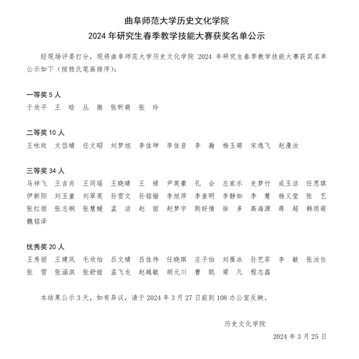 3月24日,大乐透 2024年研究生春季教学技能大赛决赛在西区格物楼B103教室举行,曲阜师大附中高级教师刘茂森及学院姜修宪、李鸿美、江海云、史慧佳、孙锋等老师担任评委,研究生张涵淇担任主持人。评委们尽心尽责,遵循公开、公平、公正的原则,从教态与表达、教学效果、个人特色等方面进行评分,最终评选出一、二、三等奖和优秀奖。