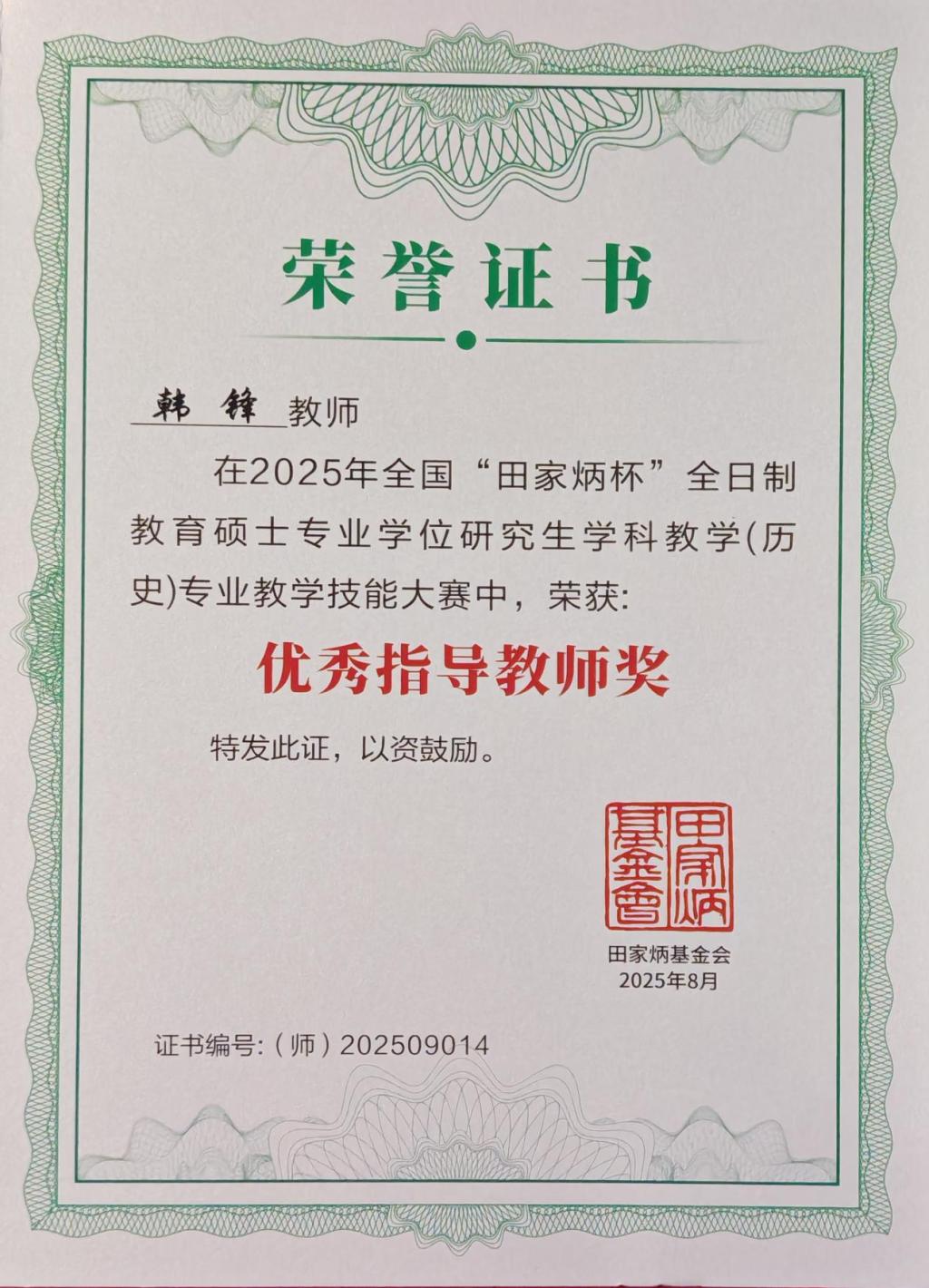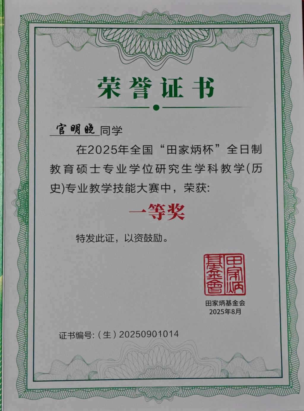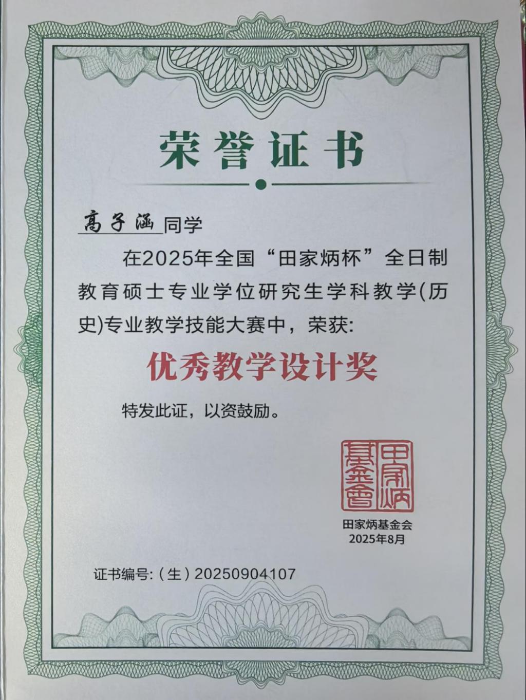 8月25日,全国“田家炳杯”全日制教育硕士专业学位研究生学科教学(历史)专业教学技能大赛决赛在内蒙古师范大学成功落下帷幕。经过国赛初选,决赛共有来自北京师范大学、华东师范大学、华中师范大学、东北师范大学等全国84所院校164名选手参赛。学院副院长吕厚轩带队参加了本次比赛。经过激烈角逐,大乐透 2024级学科教学(历史)专业研究生官明晓荣获一等奖,高子涵荣获优秀教学设计奖,指导教师韩锋荣获“优秀指导教师”奖。