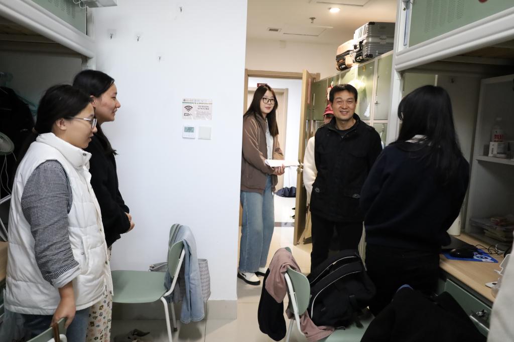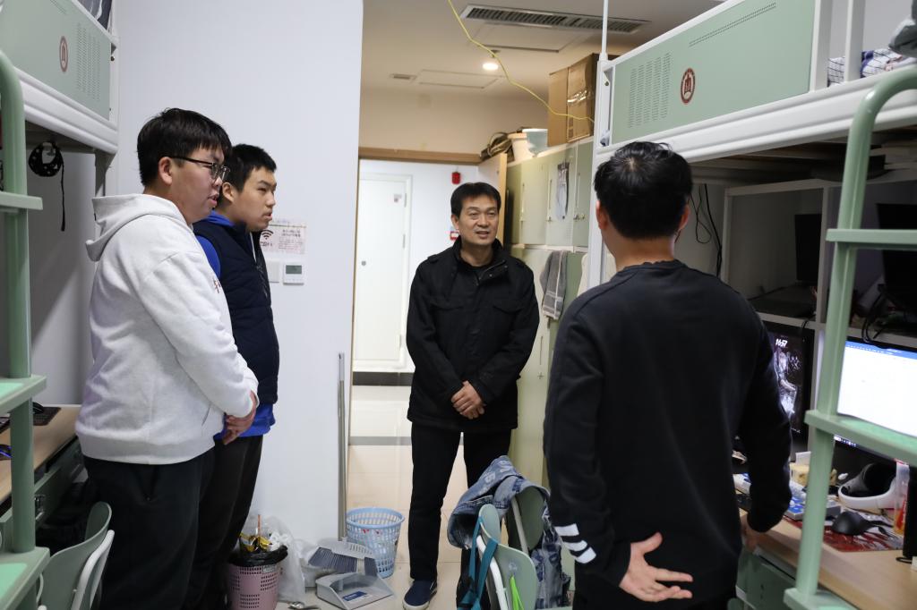 在检查过程中,孙锋就宿舍及校外租住点的用电安全、违规电器、宿舍门窗以及卫生状况等具体内容逐一进行检查,对存在问题的宿舍及校外租住点提出整改要求。同时,孙锋与同学们进行了亲切交流,询问了大家的学习生活情况,并耐心叮嘱同学们要注意宿舍安全和个人卫生,养成良好的生活习惯。