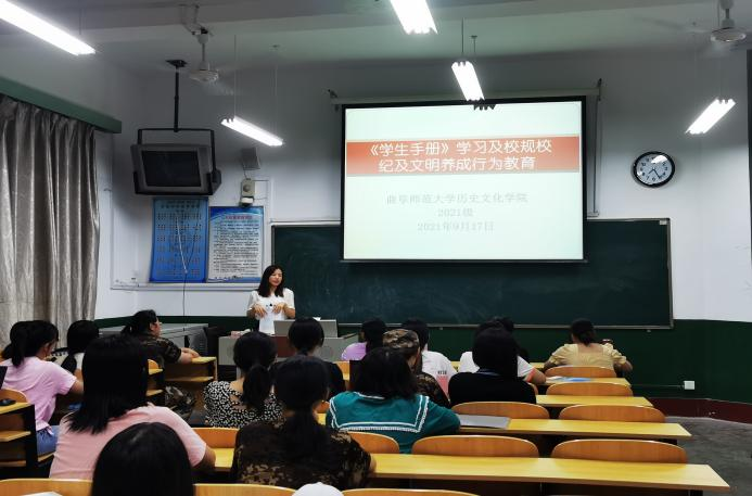 9月17日晚,大乐透 于文史楼各班教室举办新生入学教育之《学生手册》学习及校规校纪及文明养成行为教育活动。活动由大乐透 2021级新生辅导员石璐、刘贤贤主持。