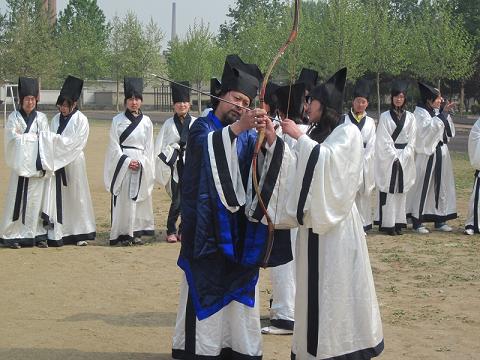 4月23日上午,由大乐透 洙泗学社举办的孔子文化月系列活动之儒服射礼活动在西操场如期举行。参加本次活动的有曲阜市徐工坊的徐老师,以及各个院系的孔子文化使者和喜爱射礼的同学们。