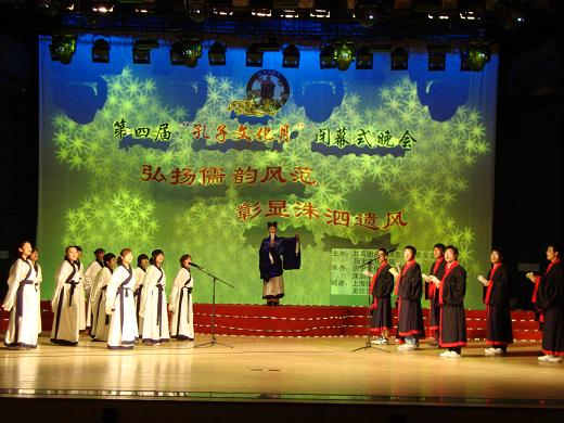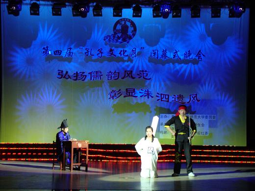 晚会首先回顾了一个多月以来,本届“孔子文化月”举办的一系列活动:国内知名儒学专家的满载学术气息的讲座,缅怀圣贤、追寻儒宗的祭祀大典,富有传统文化色彩的国学知识竞赛、大学生成人礼、历史话剧大赛等都为曲院增添了独特的风采。随后,演员们为现场观众表演了天人合一、外柔内刚的太极拳,民族器乐合奏,儒家经典诵读等一系列传统文化节目,同时,本届历史话剧中涌现出的优秀作品也在现场进行了表演,现场观众反应热烈,掌声连连。晚会现场同时公布了优秀孔子文化使者以及本届“孔子文化月”系列活动的获奖名单。