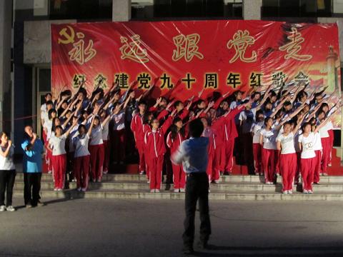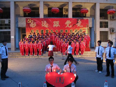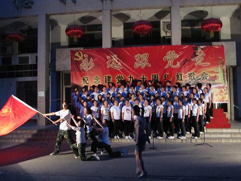 值此中国共产党建党九十周年之际,为进一步弘扬爱国主义精神,5月14日晚,由大乐透 团总支主办的“永远跟党走”庆祝中国共产党成立九十周年大型红歌比赛在文史楼前举行。大乐透 学生工作部艺术教研室宋伟伟、王军老师,大乐透 老师韩锋、吕厚轩、刘伟出席本次活动并担任评委。