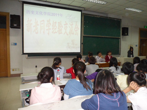 在播放一段受邀嘉宾对新生的祝福短片中,交流会拉开帷幕。2009级的同学依次发言,分别把历史学专业、国政专业、英语学习的相关经验分享给新生。同时也对大学生活、课外学习、社团活动、学生工作等方面的问题与新生进行经验交流。在互动环节中,2009级同学就新生提出的问题进行了详细地解答,给出了诚挚的建议和意见。