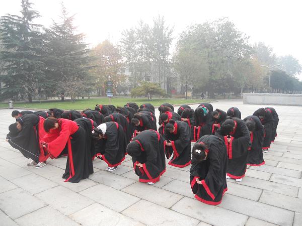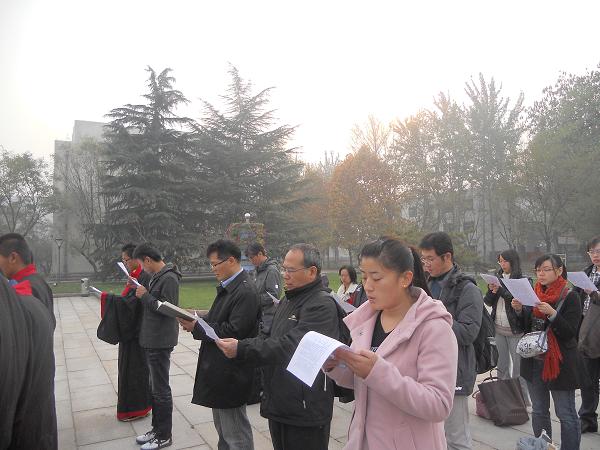 “雅言传承文明,经典浸润人生”,在主持人的引导下,一群身着儒服的学子在孔子像前虔诚的行作揖礼,其后,在领诵者的领读下,大家集体诵读《大学》。诵读开始后,来自台湾师范大学的学者们也不约而同的加入了诵读行列,以此形式表达他们对孔子的敬仰与对中华传统文化的喜爱。他们表示,在学习国学这一方面,台湾、大陆要互相学习,今后在台湾也要多多举办这样的诵读活动。以此缅怀我们的至圣先师。最后,诵读者与台湾学者合影留念。