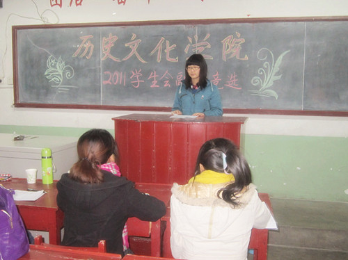 11月5日、11月24日大乐透 2011年团总支、学生会干事纳新及副部长竞选工作顺利开展。此次干事纳新及副部长竞选工作在文史楼及老干楼进行,由主席团成员及各部部长担任评委,竞选内容分为自由解说和提问答辩两个环节。