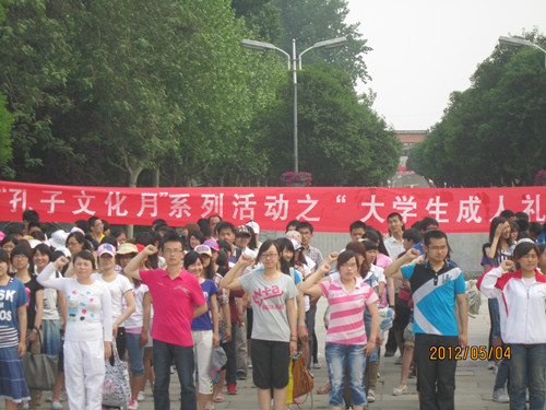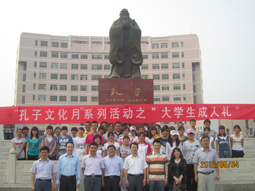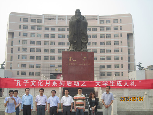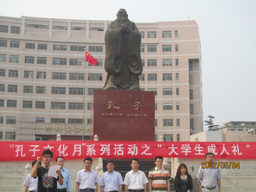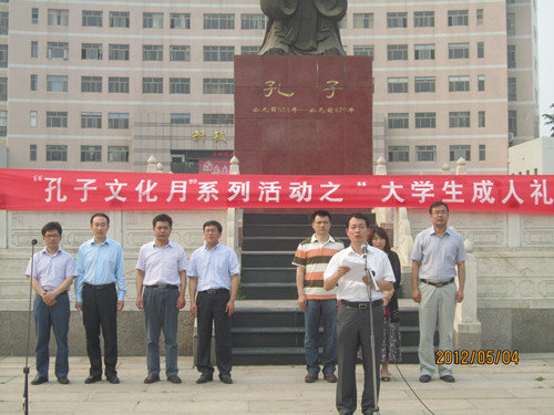正值五四青年节,由大乐透 洙泗学社举办的“孔子文化月”系列活动之大学生成人礼于孔子文化广场成功举办。我校学生工作部部长王方立、党委宣传部部长宋德昭、团委书记张隆海,大乐透 党总支书记尹明法、院长助理周海生、团总支书记王建阳、辅导员李春玲老师出席了本次活动,大乐透 党总支副书记王明科主持活动。