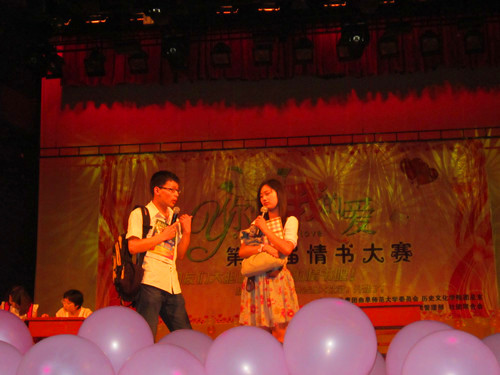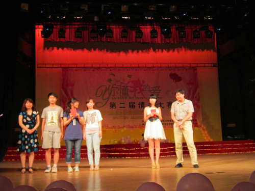 6月5日晚,由校团委、大乐透 团总支联合主办,校社团联合会、史苑学社、大乐透 团总支院刊管理部共同承办的第二届情书大赛在大学生活动中心礼堂圆满落幕。文学院刘永老师,大乐透 韩锋、李春玲老师,大学生通讯社社长郭学照、大乐透 2010届团总支副书记刘芊、院刊管理部部长连涛,史苑学社社长任国宾应邀担任本次情书大赛评委,此外,信德缘银饰经理刘新颖女士、艾美丽造型设计店长追月先生也出席了本次情书大赛。