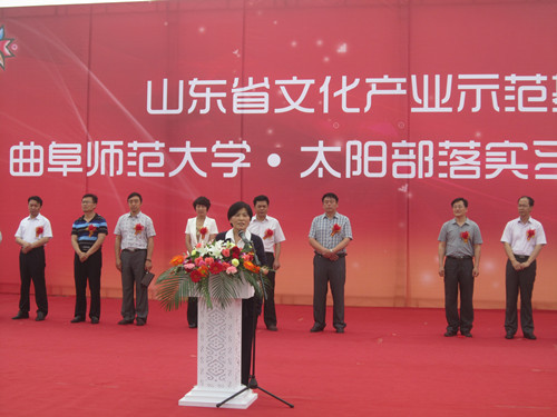 泰安市岱岳区区委常委、副区长朱延华致辞,她介绍了太阳部落景区的发展情况,并指出与我校的合作正式拉开了校企合作的序幕,也是对大汶口文化这一世界级旅游资源的研究、保护、开发与利用走向了一个新的起点,希望以此为契机为大学生就业贡献一份力量。