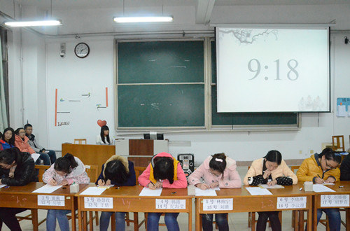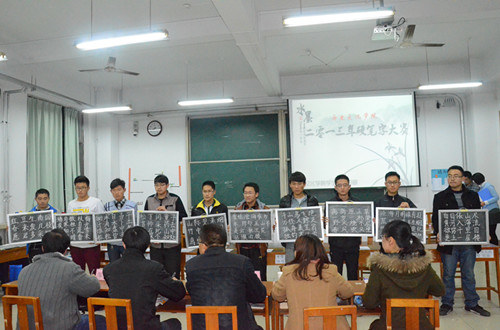 11月22日,由大乐透 团总支主办、学生会学习部承办的“素质拓展月”系列活动之2013年硬笔字大赛决赛在综合楼103室举办。大乐透 王连生、李春玲老师、社团联合会主席安秀梅、2012年粉笔字大赛一等奖获得者邹财吉等担任此次比赛的评委。