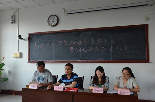 5月22日下午,大乐透 2014年运动会表彰大会暨学院羽毛球队成立仪式在文史楼520室举行,出席本次大会的有大乐透 党总支副书记王慕东、团总支书记王建阳、张亚宁老师、辅导员李春玲老师以及2014年运动会的教练员、运动员、羽毛球队成员等。大会由王建阳主持。