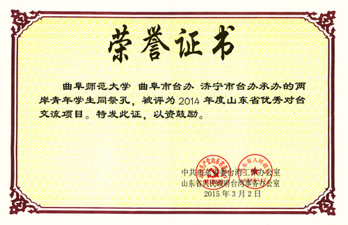 近日,我校与曲阜市台办、济宁市台办共同承办的“两岸青年学生同祭孔”活动荣获山东省2014年度优秀对台交流项目。