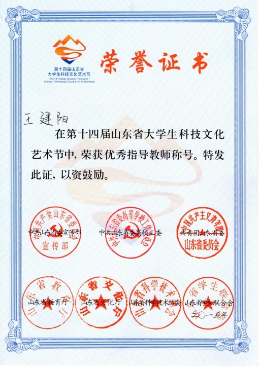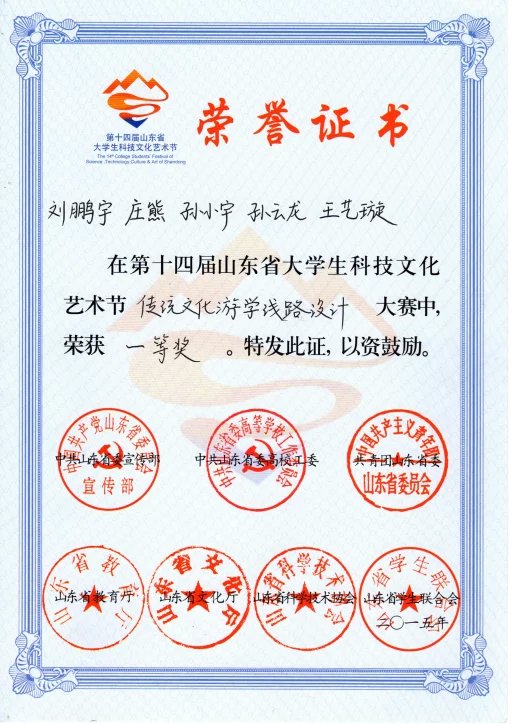 在第十四届山东省大学生科技文化艺术节——“品齐鲁古韵,寻文明足迹”传统文化游学线路设计大赛中,我院学生庄熊、孙小宇、孙云龙、刘鹏宇、王艺璇所在的团队荣获一等奖,大乐透 团总支书记王建阳获“优秀指导教师”荣誉称号。